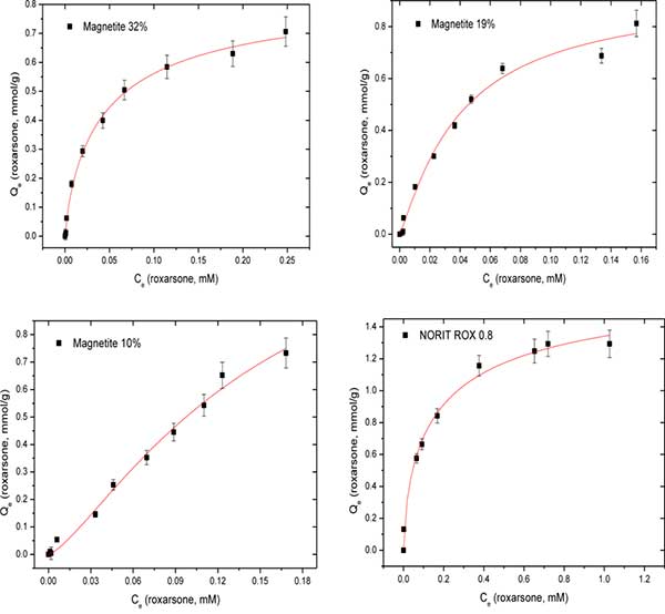 在合成磁鐵礦(Mag-P),商用磁鐵礦(Mag-C),具有可變磁鐵礦(32%,19%和10%; w / w%)的活性炭-磁鐵礦復(fù)合物的洛克沙胂等溫條件下吸著吸收結(jié)果針鐵礦如圖1和表1所示。利用活性炭實現(xiàn)了羅克沙星的最大單層吸附容量(Q m = 1.783mmol / g)。盡管活性炭含有較低的Fe含量作為雜質(zhì),因此其吸附去除羅克沙星主要歸因于非共價相互作用,例如羅克沙酮的苯環(huán)與活性炭的石墨烯表面之間的π-π堆積和氫鍵。在復(fù)合材料(CM-10,-19和-32)的情況下,隨著活性炭含量的增加,羅克沙星的Q m值增加,正如對疏水效應(yīng)影響的吸附過程所預(yù)期的那樣。相反,鐵氧化物組分,如磁鐵礦,針鐵礦和磁鐵礦的復(fù)合材料,其具有的π電子受體(路易斯酸)由于鐵物質(zhì)的吸附劑表面上存在位點,特別是對于無機砷酸鹽。