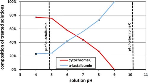 現(xiàn)用活性炭處理1:1溶液后剩余的細胞色素c和α-乳白蛋白的百分比隨溶液pH而變化很大。在pH4.0和5.0時,在等電點4.8附近除去最大量的α-乳白蛋白。(28)相比之下,最大量的細胞色素c在pH9.0被除去,最接近蛋白質(zhì)的等電點10.5。(27)在6.0或7.0的中等pH下,活性炭除去了相似量的兩種蛋白質(zhì)。